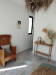 Espace cuisine séjour, il y a 1 cuisine équipée avec frigo, 1 micro-ondes, 1 four, 1 plaque de cuisson à induction, 1 lave vaisselle et tout le petit électro-ménager indispensable à de bonnes vacances. Il y a d’autre part une table ronde et quatre chaises stark.