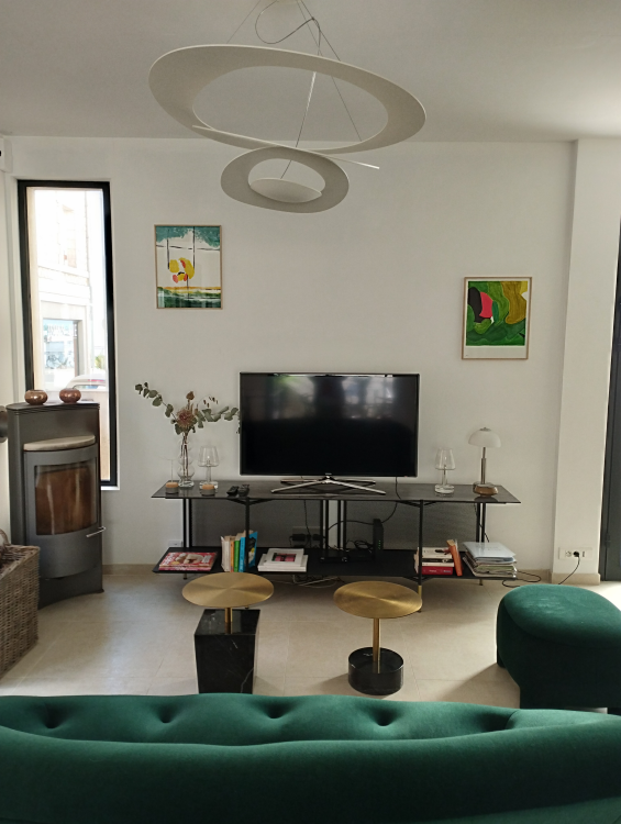 Le salon meuble tv avec grande tv, internet avec fibre, canapé 3 places et pouf, un meuble de rangement, 2 tables basses, un poêle à bois.